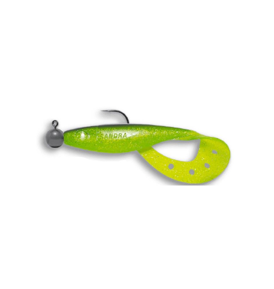 Leurre de référence dans le monde entier, le Sandra a su séduire aussi bien les poissons que les pêcheurs. Formé d’un corps long et assez trapu, le Sandra se termine par une longue queue courbée, large mais fine, percée de trous et dont l’extrémité est échancrée. En moulinant à petite vitesse, cette queue forme des ondulations de très grandes amplitudes qui génèrent de puissantes vibrations à basse fréquence.
