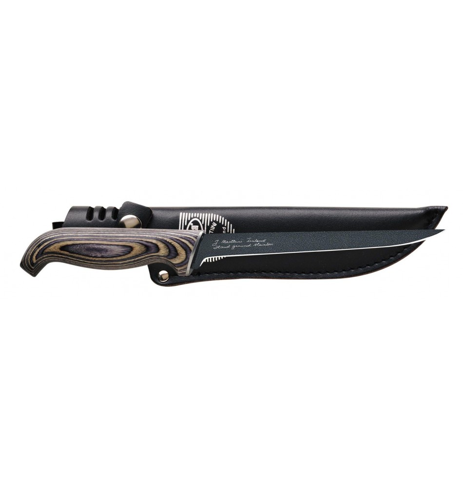 Le design nordique remis au goût du jour crée un look classique moderne. La version avec le manche plastifié marron possède une lame en acier inoxydable. Celle avec le manche plastifié gris possède une lame avec un revêtement PTFE. La lame effilée parcourt toute la longueur du manche (full tang) pour un meilleur bras de levier. Étui assorti en cuir véritable travaillé à la main, fermeture par pression. Présentation sous blister.
