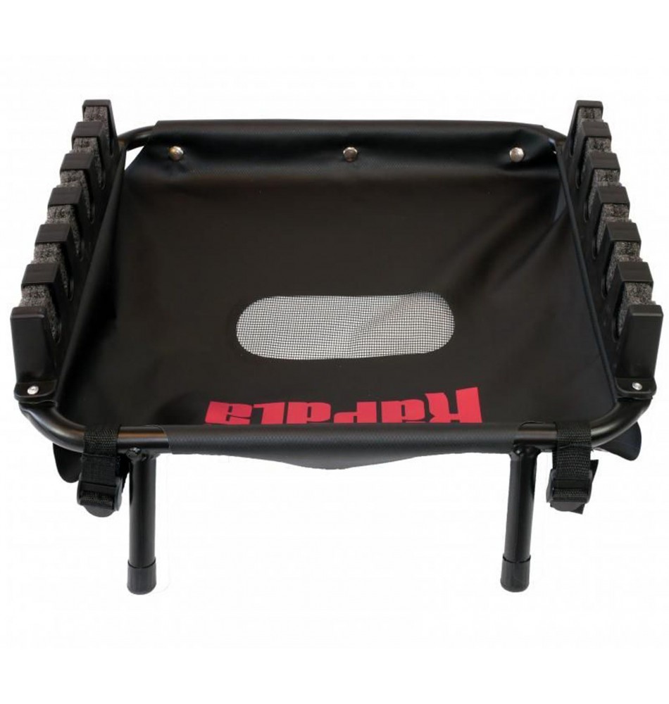 Il s'adapte à tout float tube, montage facile et rapide, il vous permettra de disposer de toutes vos cannes montées en un tour de main. Le système de rétention des cannes en mousse haute densité préformée s'adapte à tous les diamètres de cannes et vous permet de prendre les cannes ou de les reposer d'une seule main. Le bac en toile PVC dispose d'une évacuation d'eau en son centre (filet), qui est l'endroit parfait pour déposer quelques leurres en prévision des changements.