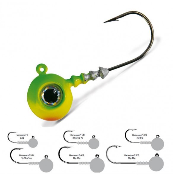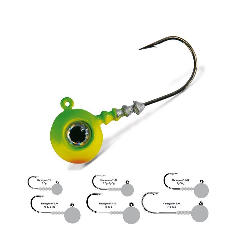 Ces têtes plombées rondes très polyvalentes bénéficient d’un signal oeil très important. Parfaites pour pêcher en linéaire en variant les vitesses de récupérations suivant l’activité des poissons ou en faisant légèrement rebondir la tête sur le fond tout en privilégiant les animations plutôt lentes.